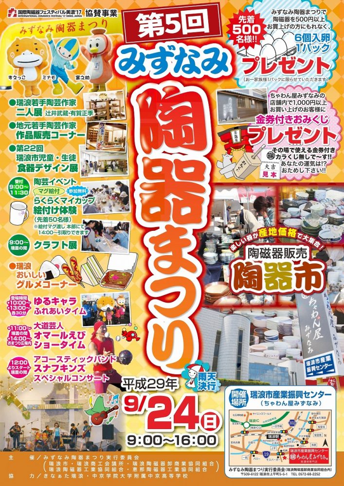 瑞浪の陶磁器直売のほか、地元陶芸家の作品コーナー、絵付け体験など、多彩なイベントが展開されます。